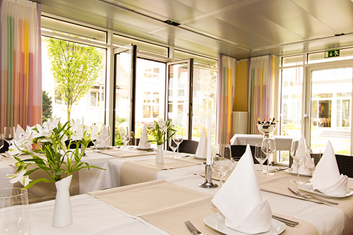 Hinter unserem Innenhof befindet sich unser kleiner Saal, der zusätzlich direkt durch die Tiefgarage erreichbar ist. Hier können Sie Ihre private Veranstaltung mit bis zu 40 Personen feiern. Wir bieten Ihnen ein Buffet oder ein Menü an, Sie haben die Wahl. Möglichkeiten für eine Musikanlage stehen wie auch im Restaurant zur Verfügung. Im Sommer können Sie die Flügeltüren öffnen und direkt in unseren Garten treten. Unser kleiner Saal lässt sich individuell dekorieren und ist somit für fast jede Veranstaltung geeignet. Gerne zeigen wir Ihnen in einer kleinen Führung alle Möglichkeiten. Sprechen Sie einfach unser Personal an, dies berät Sie gerne.